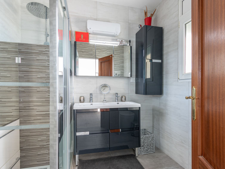 5-Zimmer-Villa 224 m2 auf 2 Stockwerken. Geräumig und hell, komfortabel und stilvoll eingerichtet: Wohn-/Esszimmer 39 m2 mit Sat-TV. Ausgang zur Terrasse, zum Schwimmbad. 1 Zimmer 15 m2 mit 1 franz. Bett (160 cm, Länge 190 cm), Dusche/WC, Klimaanlage und Warmluftheizung. Ausgang zur Terrasse. 1 Zimmer 11 m2 mit 1 franz. Bett (150 cm, Länge 190 cm), Klimaanlage und Warmluftheizung. 1 Zimmer mit 2 Betten (90 cm, Länge 190 cm), Klimaanlage und Warmluftheizung. Offene Küche (Backofen, Geschirrspüler, 3 Induktionskochplatten, Toaster, Wasserkocher, Mikrowelle, Tiefkühler, elektrische Kaffeemaschine) mit Esstisch. Bad/WC. Obergeschoss: (Aussentreppe) 1 Zimmer mit 1 franz. Bett (150 cm, Länge 190 cm), Dusche/WC, Klimaanlage und Warmluftheizung. Ausgang zur Terrasse. Grosse Terrasse. Terrassenmöbel, Gartengrill, Liegestühle. Herrliche Panoramasicht auf das Meer und die Berge. Zur Verfügung: Waschmaschine, Bügeleisen, Haartrockner. Internet (WLAN, gratis). Parkplatz (3 Autos) beim Haus. Bitte beachten: ein Doppelzimmer liegt außerhalb der Wohnung. Nichtraucher-Haus. TV nur DE, FR, ES. Kein Fahrstuhl. HUTG-064538 // Reg. Nr.: ESFCTU00001700800097820600000000000000000HUTG-0726257