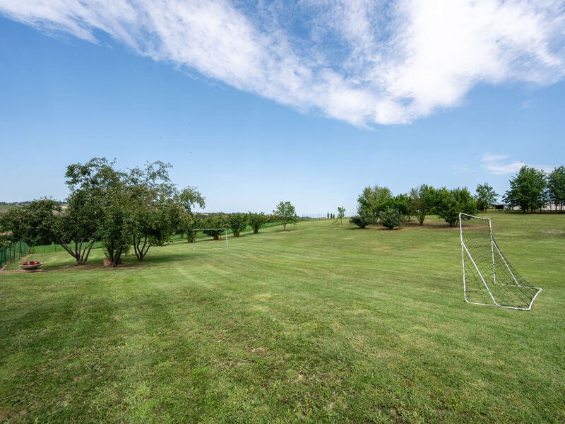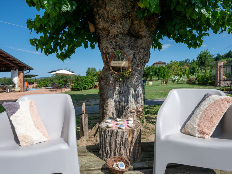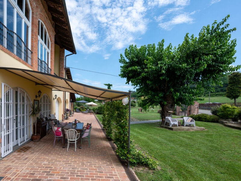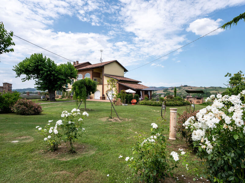 Groot cottage "La Bell'aria", vrijstaand. Aan de rand van de plaats, 1 km van het centrum van Frinco, verhoogde ligging. Voor alleengebruik: terrein 4.500 m2 (omheind) met planten en bomen, wilde tuin, weide. Buitendouche, hot tub, tafeltennis, badminton, patio, prieel (20 m2), terras, tuinmeubelen, grill, parkeerplaats (voor 3 auto's) bij het huis op het terrein. Bushalte 1 km. Attracties in de buurt: Asti 15 km, Casale Monferrato 37 km, Alba 45 km, La Morra 55 km, Barolo 52 km, Torino 76 km. Auto noodzakelijk. het kuuroord is geopend van 30.04.-15.09. Gasten kunnen gebruikmaken van het zwembad (20 x 4 m, 01.06.-15.09.) En de snackbar van Agriturismo, ongeveer 100 m, tegen betaling (EUR 15 per persoon per dag).