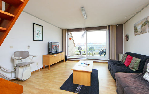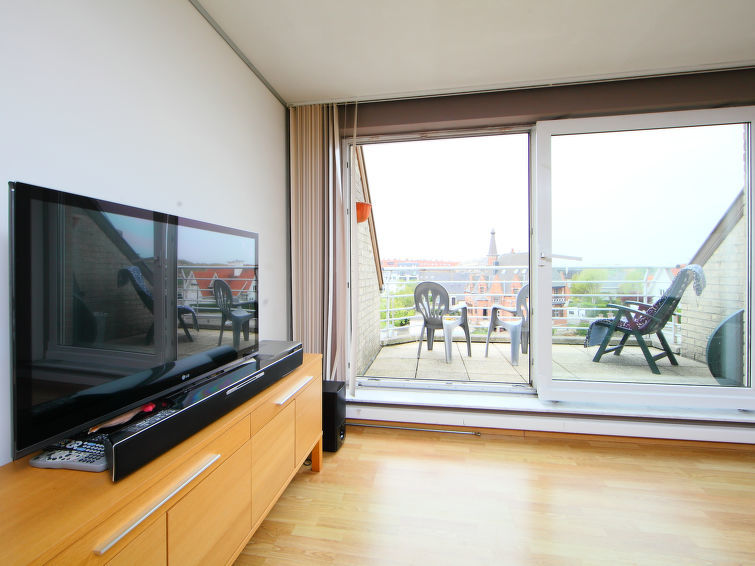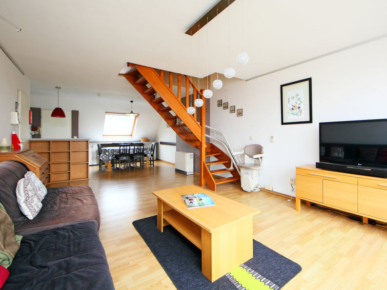 "Tussen water en wind", appartement 3-kamers 80 m2 op 2 verdiepingen op de 3e verdieping. Ruim, gedeeltelijk gerenoveerd in 2020, comfortabel en gezellig ingericht: hal met aparte WC. 1 kleine kinderkamer met 1 uitschuifbaar bed (2 x 80 cm, lengte 200 cm). Woon-/eetkamer met TV, internationale TV-zenders, Flatscreen TV, CD-speler, DVD, homecinema elektrische verwarming en air-conditioning. Open keuken (afwasmachine, 4 keramische glas kookplaten, broodrooster, waterkoker, diepvriezer, elektrische koffiemachine, combimagnetron) met eettafel. Aparte WC. Bovenverdieping: (wenteltrap), 1 2-pers. kamer met 1 2-pers bed (1 x 160 cm, lengte 200 cm). Bad/douche/WC, dubbele wastafels. Balkon, op het zuidwesten gelegen. Balkonmeubilair. Ter beschikking: wasmachine, droger, haardroger. Internet (Internet (WiFi), gratis). Let op: rookvrij huis, geen parkeerplaats. Traplift in de woning.
