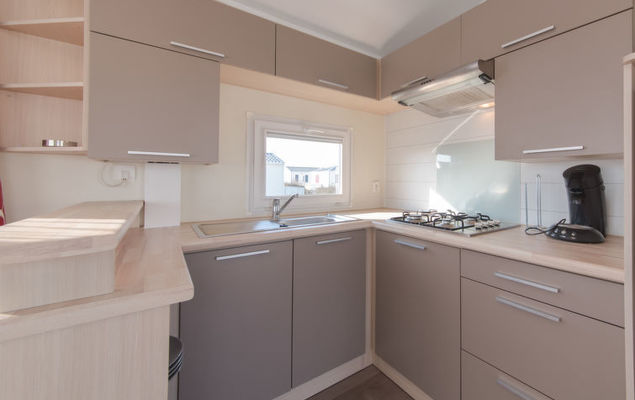 3-kamers mobilhome 34 m2. Doelmatig en comfortabel ingericht: woon-/eetkamer met Digitale TV, internationale TV-zenders, Flatscreen TV, radio en CD-speler. 1 2-pers. kamer met 2 bedden (90 cm, lengte 200 cm). 1 2-pers. kamer met 1 2-pers bed (1 x 140 cm, lengte 200 cm). Open keuken (4-pits kookplaat, elektrische koffiemachine). Douche, aparte WC. Elektrische verwarming. Terras 15 m2. Ter beschikking: Internet (Internet (WiFi), gratis). Parkeerplaats (extra). Let op: rookvrij huis. Rookmelders, brandblusser.