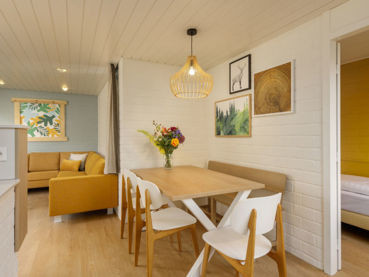 "Comfort Cottage", huis in een rij 4-kamers 64 m2. Comfortabel ingericht: woon-/eetkamer met open haard, eettafel en Flatscreen TV. Uitgang naar het terras. 2 2-pers. kamers, elke kamer heeft 2 bedden. 1 kamer met 1 bed. Open keuken (4-pits kookplaat, afwasmachine, broodrooster, waterkoker, elektrische koffiemachine, combimagnetron). Douche/WC. Terras. Terrasmeubelen. Ter beschikking: kinderstoel, kinderbed. Internet (Internet (WiFi), gratis).