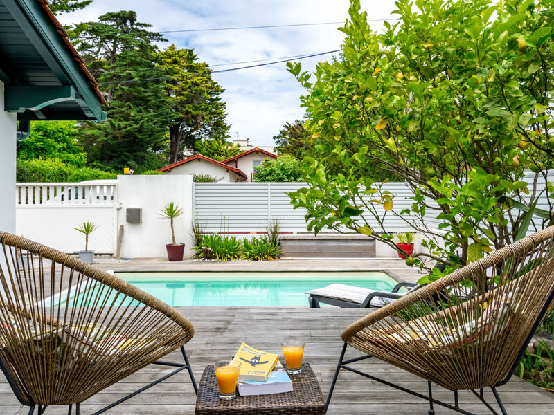 Anglet 2 km van Biarritz: Villa "Liserons". Golf du Phare, rustige ligging, 1.6 km van zee, 1.6 km van het strand. Voor alleengebruik: terrein 460 m2, tuin gazon en planten, openluchtzwembad verwarmd (3 x 5 m, seizoensgebonden beschikbaarheid: 01.Jun. - 30.Sep.) met oprolbaar afdekscherm. Parkeerplaats (voor 2 auto's) op het terrein. Winkel, levensmiddelenwinkel 600 m, restaurant 500 m, bushalte "Larochefoucault" 700 m, zandstrand "Le Miramar" 1.6 km, thermaalbad "Athlantal" 4.6 km. Golfterrein (18 holes) 800 m, surfschool 1.6 km, tennis 1.2 km, manege 12.9 km. Attracties in de buurt: Golf du Phare 800 m, Halles des 5 Cantons 1.3 km, Phare de biarritz 1.9 km, Aquarium 3 km, Bayonne 6.2 km, Saint-Jean-de-Luz 17 km. Wandelgebied Le Sentier du Littoral 800 m, La Rhune 28 km.