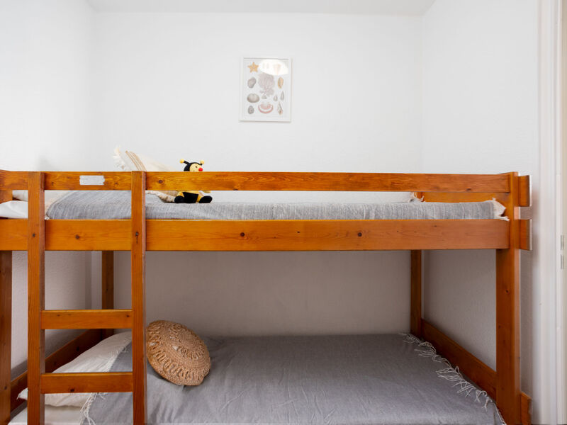 Appartement 1-kamer 21 m2 op de 2e verdieping. Woon-/eetkamer met 1 2-pers divanbed (130 cm, lengte 190 cm), TV (Flatscreen TV). Hal met 1 x 2 stapelbedden (80 cm, lengte 190 cm). Kookhoek (3 keramische glas kookplaten, broodrooster, waterkoker, elektrische koffiemachine, combimagnetron). Douche/WC. Terras 8 m2, op het zuiden gelegen. Terrasmeubelen. Uitzicht op het zwembad. Ter beschikking: Internet (Internet (WiFi), extra). Parkeerplaats. Maximaal 1 huisdier/hond toegestaan. Rookmelders.