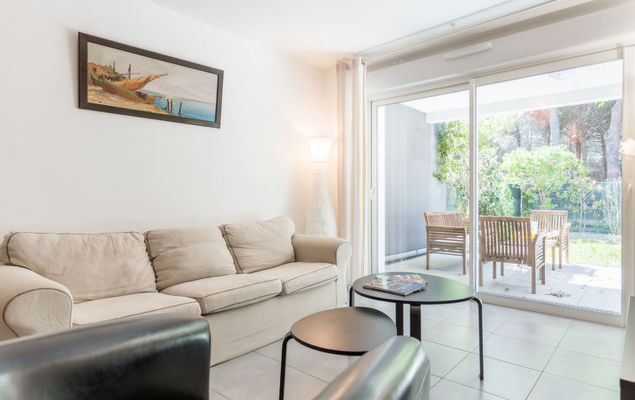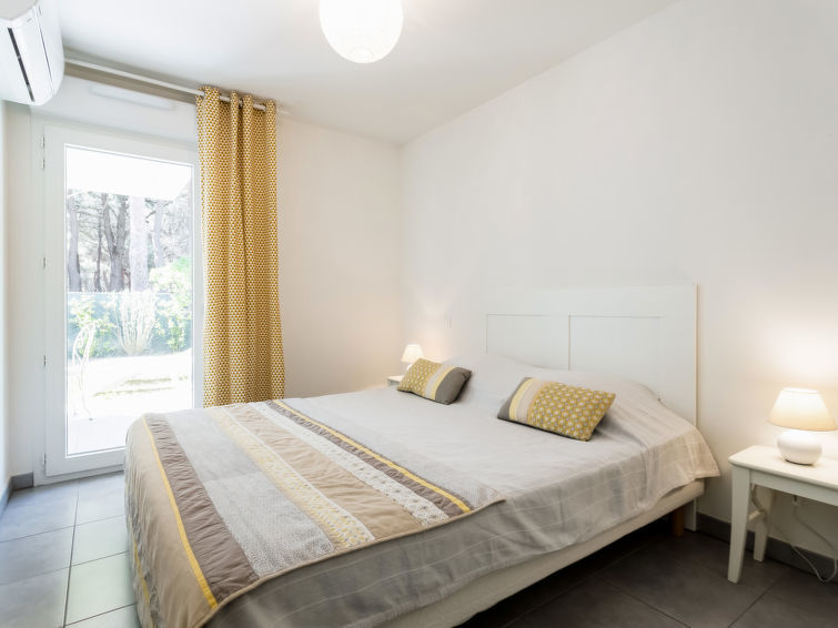 "Les Pins Parasols (AGL350)", appartement 3-kamers 60 m2, op de begane grond. Licht, modern ingericht: woon-/eetkamer met eettafel, Sat-TV en elektrische rolluiken. Uitgang naar het terras, op het zuiden. 1 kamer met 1 2-pers bed (160 cm), elektrische rolluiken. Uitgang naar het terras. 1 kamer met 2 bedden (90 cm), elektrische rolluiken. Uitgang naar de tuin, op het noorden. Open keuken (oven, afwasmachine, 4 keramische glas kookplaten, broodrooster, waterkoker, magnetron, elektrische koffiemachine). 2 douche/WC's. Elektrische verwarming, air-conditioning. Terras 15 m2 gedeeltelijk overdekt, tuin 60 m2, op het zuiden gelegen en op het noorden gelegen. Terrasmeubelen, barbecue (verrijdbaar), ligstoelen (2). Ter beschikking: wasmachine, kinderstoel, kinderbed. Internet (Internet (WiFi), gratis). Parkeerplaats, garage. Let op: niet rokers woning.