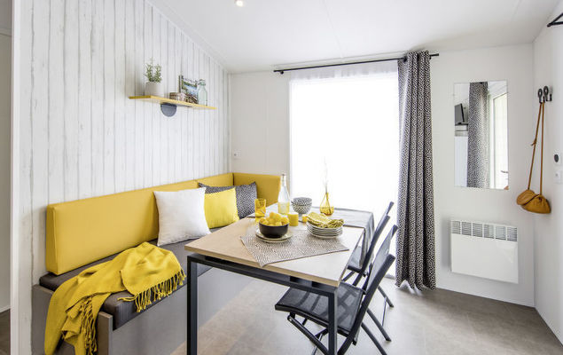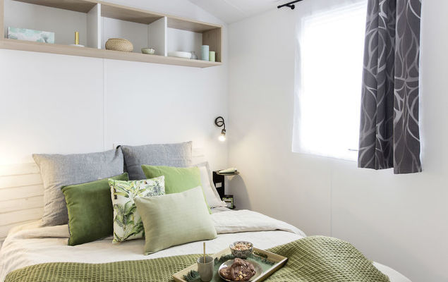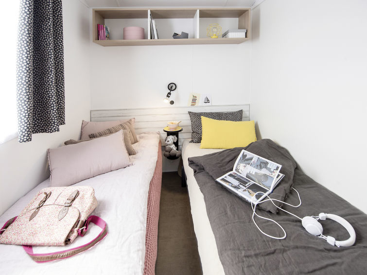 "Camping La Plage (AGL271)", 3-kamers mobilhome 28 m2. Doelmatig ingericht: woon-/eetkamer met eettafel en TV. 1 kamer met 1 2-pers bedden. 1 kamer met 2 bedden (80 cm). Kookhoek (4 kookpitten (vlammen), magnetron, diepvriezer, elektrische koffiemachine). Douche, aparte WC. Elektrische verwarming, air-conditioning. Terras gedeeltelijk overdekt. Terrasmeubelen. Ter beschikking: kinderstoel, kinderbed tot 2 jaar (extra). Internet (Internet (WiFi), extra). Maximaal 2 huisdieren/honden toegestaan.