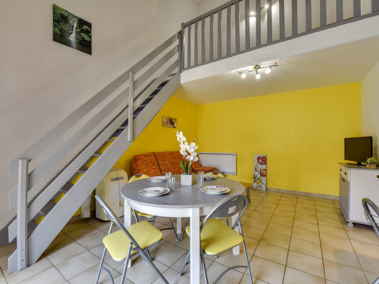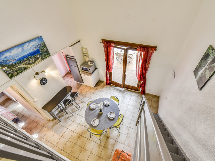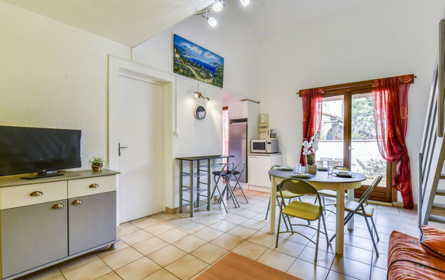 Huis in een rij 3-kamers 47 m2. Woon-/eetkamer met 1 divanbed (140 cm, lengte 190 cm), TV (Flatscreen TV). Uitgang naar het terras. 1 kamer met 1 2-pers bed (1 x 140 cm, lengte 190 cm). Kookhoek in de hal (oven, afwasmachine, 3 inductiekookplaten, diepvriezer, elektrische koffiemachine). Douche/WC. Elektrische verwarming. Bovenverdieping: 1 kamer met 1 2-pers bed (1 x 140 cm, lengte 190 cm). Terras 30 m2. Terrasmeubelen, barbecue. Ter beschikking: wasmachine. Let op: rookmelders.
