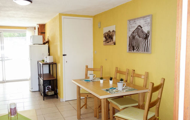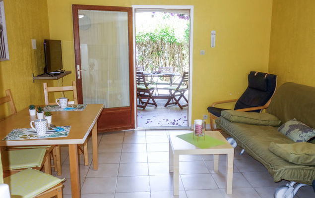 Appartement 3-kamers 47 m2 op 2 verdiepingen, op de begane grond. Comfortabel en mooi ingericht: woon-/eetkamer met 1 divanbed (160 cm, lengte 190 cm), TV. Uitgang naar het terras. Open keuken (oven, 4 keramische glas kookplaten, broodrooster, waterkoker, magnetron, diepvriezer, elektrische koffiemachine). Bovenverdieping: 1 kamer met 1 2-pers bed (160 cm, lengte 200 cm). Uitgang naar het balkon. 1 kamer met 1 bed (80 cm, lengte 190 cm). Douche/WC. Balkon 5 m2, terras 15 m2 gedeeltelijk overdekt, op het westen gelegen. Terrasmeubelen. Ter beschikking: wasmachine, strijkijzer. Internet (Internet (WiFi), gratis). Parkeerplaats nr. 12. Let op: niet rokers woning. Maximaal 1 huisdier/hond toegestaan. TV alleen FR. Rookmelders.