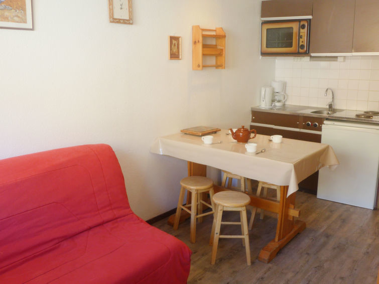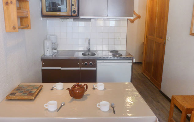 "vanoise 578", studio 1-kamer 21 m2 op de 5e verdieping, op het noordoosten gelegen. Gedeeltelijk gerenoveerd in 2020, doelmatig en mooi ingericht: woon-/eetkamer met 1 2-pers divanbed (1 x 140 cm, lengte 190 cm), TV (Flatscreen TV), elektrische kachel. Uitgang naar het balkon, op het noordoosten. Hal met 1 x 2 stapelbedden (80 cm, lengte 190 cm). Kookhoek (afwasmachine, 2 keramische glas kookplaten, waterkoker, magnetron, elektrische koffiemachine). Badkamer, aparte WC. Klein balkon 2 m2, op het noordoosten gelegen. Ter beschikking: Internet (Internet (WiFi), extra). Let op: niet rokers woning. Rookmelders.