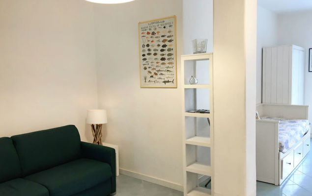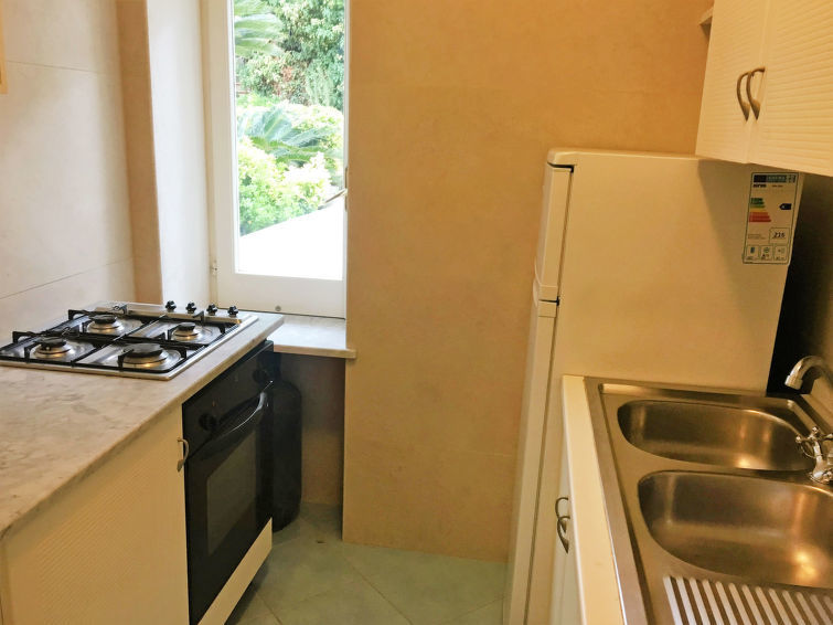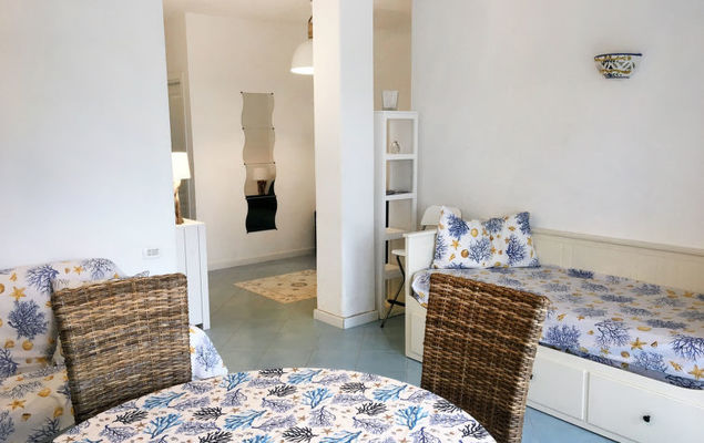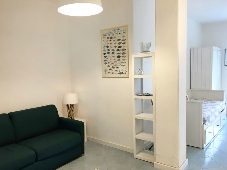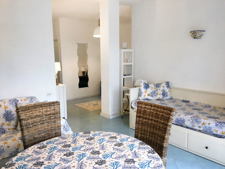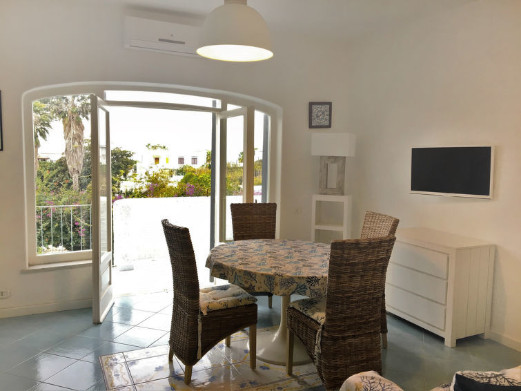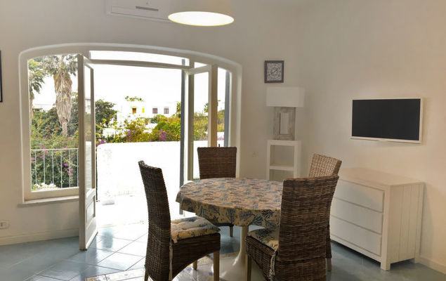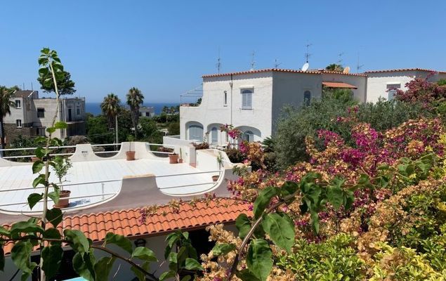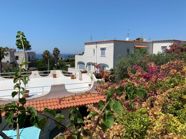 "Pithecusa", appartement 3-kamers 80 m2 op de 1e verdieping. Licht, doelmatig en comfortabel ingericht: open woon-/eetkamer met 1 bed, eettafel en Kabel-TV (Flatscreen TV), air-conditioning en heteluchtverwarming. Uitgang naar het balkon. 1 2-pers. kamer met panoramavenster. 1 kamer met 1 x 2 stapelbedden. Kleine keuken (4-pits kookplaat, oven, diepvriezer). 2 douche/bidet/WC's. Klein balkon 5 m2. Balkonmeubilair. Zeer mooi uitzicht op zee en de plaats. Ter beschikking: wasmachine, haardroger. Internet (Internet (WiFi), gratis). Geschikt voor families.