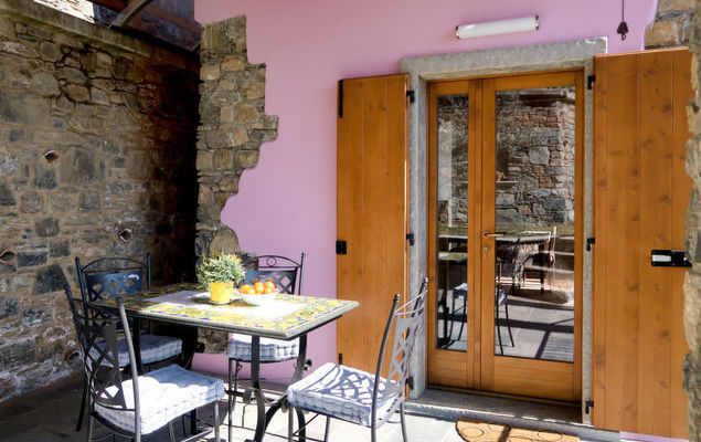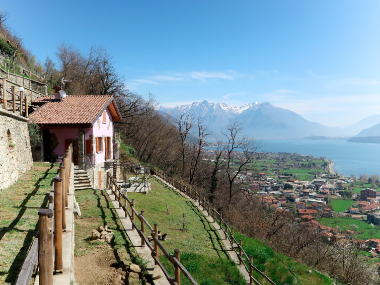Huis 3-kamers 80 m2 op 2 verdiepingen. Gerenoveerd in 2018, mooi en met veel hout ingericht: Bovenverdieping: woon-/slaapkamer met 1 2-pers divanbed, eettafel en TV. Uitgang naar het balkon, naar het terras. Open keuken (oven, afwasmachine, 4 kookpitten (vlammen), broodrooster, waterkoker, diepvriezer, elektrische koffiemachine). Douche/WC. Zolderverdieping: (steile trap) open doorgangskamer met afgeschuinde daken met 1 2-pers bed. Met afgeschuinde daken, 1 kamer, zonder ramen met 1 x 2 stapelbedden. Gas-verwarming. Houten vloeren. Klein balkon, terras overdekt, groot terras, prieel. Terrasmeubelen, balkonmeubilair, barbecue, ligstoelen (4). Mooi panoramazicht op het meer, de bergen en Monte Legnone (2609 m). Ter beschikking: wasmachine, kinderstoel, kinderbed. Internet (Internet (WiFi), gratis). Let op: niet rokers woning. CIR: 013218-CNI-00021