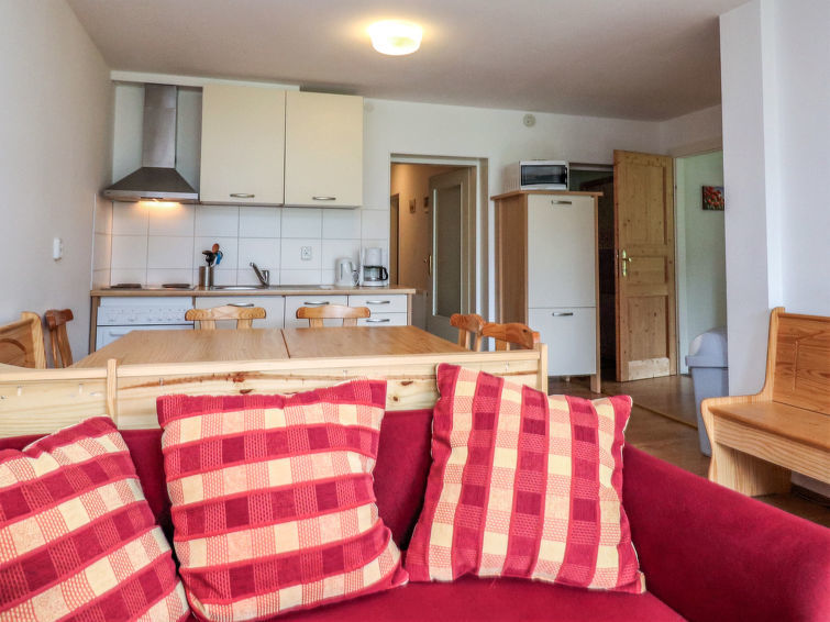 "Spatzennest", appartement 5-kamers 82 m2 op de 1e verdieping. Het objekt is geschikt voor 4 volwassenen + 4 kinderen. Licht, gezellig ingericht: groot woon-/eetkamer met eettafel, kookhoek en Sat-TV. Uitgang naar het balkon. 1 2-pers. kamer. 1 kamer met 1 2-pers bed (160 cm, lengte 200 cm). Uitgang naar het balkon. 2 kinderkamers, elke kamer heeft 1 x 2 stapelbedden (80 cm, lengte 200 cm). Open keuken (4-pits kookplaat, oven, afwasmachine, magnetron, diepvriezer, elektrische koffiemachine). 2 douche/WC's. Groot balkon. Balkonmeubilair. Mooi uitzicht op de bergen en de plaats. Ter beschikking: Internet (Internet (WiFi), gratis). Let op: niet rokers woning. Rookmelders, brandblusser, geen lift.