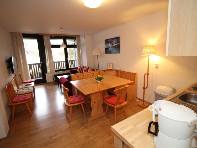 "Spatzennest / Top 7", appartement 5-kamers 82 m2 op de 1e verdieping. Het objekt is geschikt voor 4 volwassenen + 4 kinderen. Licht, gezellig ingericht: groot woon-/eetkamer met eettafel, kookhoek en Sat-TV. Uitgang naar het balkon. 1 2-pers. kamer. 1 kamer met 1 2-pers bed (160 cm, lengte 200 cm). Uitgang naar het balkon. 2 kinderkamers, elke kamer heeft 1 x 2 stapelbedden (80 cm, lengte 200 cm). Open keuken (4-pits kookplaat, oven, afwasmachine, magnetron, diepvriezer, elektrische koffiemachine). 2 douche/WC's. Groot balkon. Balkonmeubilair. Mooi uitzicht op de bergen en de plaats. Ter beschikking: Internet (Internet (WiFi), gratis). Niet rokers woning. Rookmelders, brandblusser, geen lift.