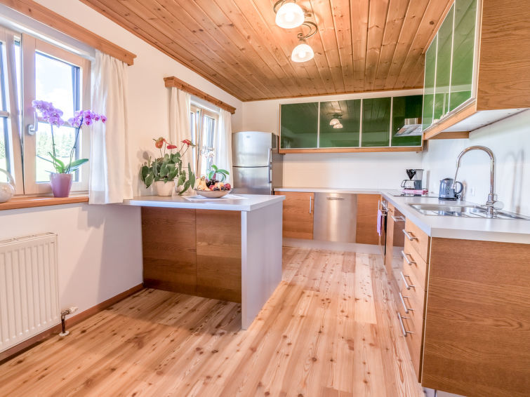 Chalet 6-kamers 130 m2. Ruim, gedeeltelijk afgeschuinde daken, comfortabel en stijlvol ingericht: eetkamer met eethoek, Kabel-TV en tegelkachel. Uitgang naar het terras. Woonkamer. Open keuken (oven, afwasmachine, 4 keramische glas kookplaten, diepvriezer, elektrische koffiemachine). Douche/bidet/WC, aparte WC, dubbele wastafels. Souterrain: 1 2-pers. kamer met douche/WC. 1 kamer met 2 bedden. Bovenverdieping: 1 2-pers. kamer. Uitgang naar het balkon. 1 kamer met 2 bedden. Groot terras, op het zuiden gelegen. Terrasmeubelen, balkonmeubilair, ligstoelen, bergruimte. Mooi panoramazicht op de bergen en het landschap. Ter beschikking: wasmachine, kluis, strijkijzer, kinderstoel, kinderbed, haardroger, haardhout (gratis). Internet (Internet (WiFi), gratis). Let op: rookvrij huis. Rookmelders, brandblusser. Bedden zijn gemaakt van fijn dennenhout met hoogwaardige matrassen en beddengoed van lokale productie garanderen een goede en rustgevende nacht. Als er minder dan het maximale aantal gasten in de accommodatie verblijft, zijn niet alle wooneenheden beschikbaar voor gebruik.