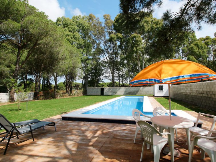 Bungalow "Miraalba". 6 km van het centrum van Chiclana de la Frontera, 15 km van het centrum van Conil de la Frontera, 32 km van het centrum van Cádiz, 7 km van zee, 7 km van het strand. Voor alleengebruik: terrein 2.200 m2 (omheind), tuin met planten en bomen, openluchtzwembad (17 x 4 m, 110 - 180 cm diepte, 01.01.-31.12.). Buitendouche, terras, tuinmeubelen, barbecue, parkeerplaats (voor 2 auto's) op het terrein. Winkel 2 km, supermarkt 3 km. Golfterrein (18 holes) 5 km. Let op: auto noodzakelijk.