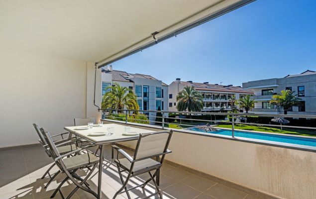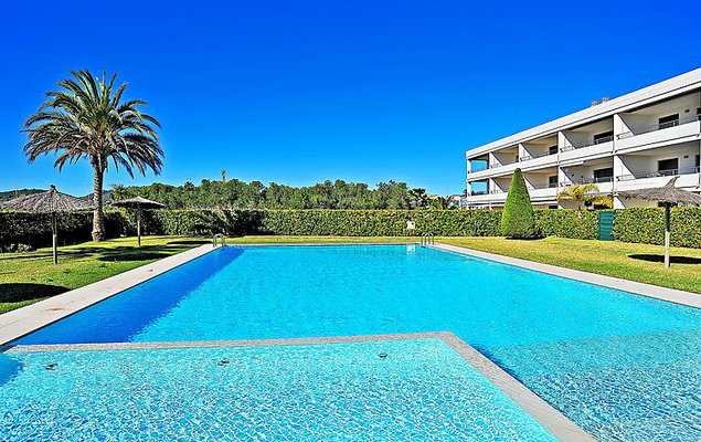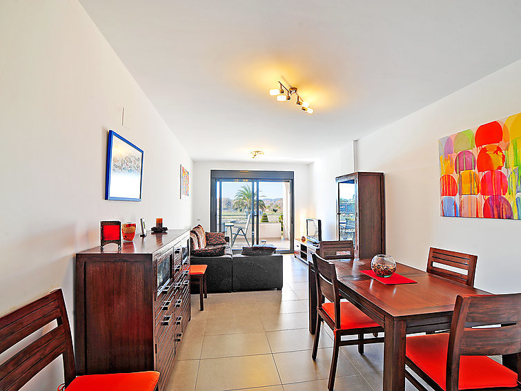 Appartement 3-kamers 75 m2 op de 1e verdieping. Ruim en licht, zeer comfortabel en smaakvol ingericht: woon-/eetkamer met Digitale TV en air-conditioning. Uitgang naar het terras. 1 kamer met 2 bedden en air-conditioning. 1 kamer met 1 2-pers bed (2 x 150 cm), bad/bidet/WC en air-conditioning. Uitgang naar het terras. Keuken (oven, afwasmachine, 4 keramische glas kookplaten, magnetron, diepvriezer, elektrische koffiemachine). Douche/WC. Groot terras 18 m2. Terrasmeubelen. Mooi uitzicht op het zwembad. Ter beschikking: wasmachine. Internet (Internet (WiFi), gratis). Garage nr. 24. Let op: niet rokers woning. TV alleen ES. AT446962